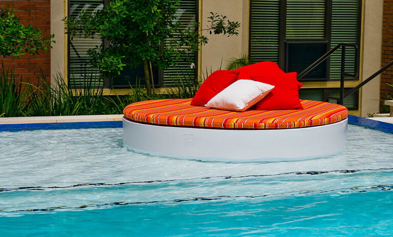 Esta cama redonda foi especificamente concebida para áreas de piscina pouco profundas, tornando-a perfeita para utilização com a sua plataforma poolconcept. Tem uma forma redonda e é feito de resina UV20 e tecido marinho resistente a UV. O acolchoamento usado nesta cama é EZ-Dri que seca rapidamente. Você pode personalizar a cor para se misturar com o seu ambiente.